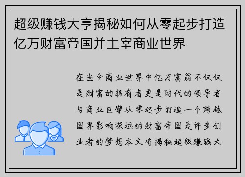 超级赚钱大亨揭秘如何从零起步打造亿万财富帝国并主宰商业世界